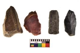| Description / विवरण | There are n 4 utilized flakes. There are multi directional irregular scar pattern on both dorsal and ventral face of the flakes. Two have pointed edges and two have blunted edges. |