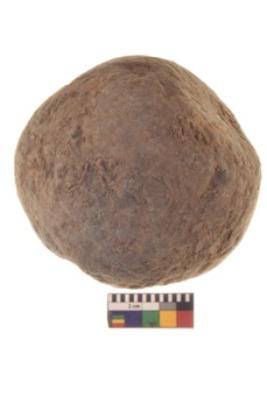 | Description / विवरण | Specimen of a roughly rounded hammer stone with battered surface. |