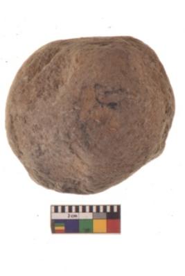 | Description / विवरण | Specimen of a spherical shaped hammer stone with battered surface. |