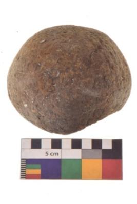 | Description / विवरण | Specimen of a spherical shaped hammer stone with battered surface. |