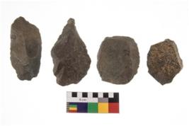 | Description / विवरण | There are n 4 utilized flakes. There are multi directional irregular scar pattern on both dorsal and ventral face of the flakes. One is pointed base and one is blunted and two are sharp edges. |