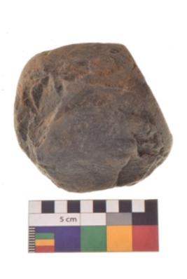 | Description / विवरण | Specimen of a Hammer stone roughly rounded in shape with grounded edges and flattish base. |