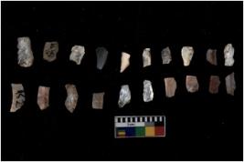 | Description / विवरण | Specimen of flakes tool with prominent flaking marks. It made up of a short flakes with sides trimmed. |