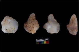 | Description / विवरण | There are n 4 utilized flake cores. There are multidirectional irregular scar pattern on both dorsal and ventral face of the flake cores. One has sharp edges and three have blunted edges. |