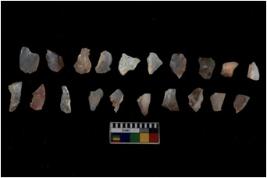 | Description / विवरण | Specimen of flakes tool with prominent flaking marks. It made up of a short flakes with sides trimmed. |
