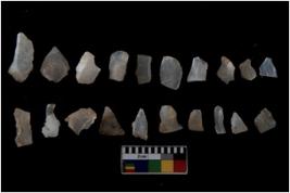 | Description / विवरण | Specimen of flakes tool with prominent flaking marks. It made up of a short flakes with sides trimmed. |