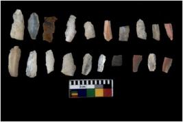 | Description / विवरण | Specimen of flakes tool with prominent flaking marks. It made up of a short flakes with sides trimmed |