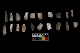| Description / विवरण | Specimen of flakes tool with prominent flaking marks. It made up of a short flakes with sides trimmed. |