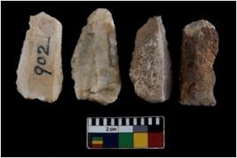 | Description / विवरण | There are n 04 worked utilised cores; among them all are having ridges made out of removing blades. All of them are having flat base. Three are tapering at one end. |