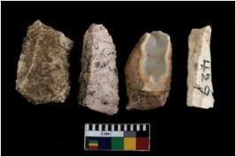 | Description / विवरण | There are n 04 worked utilised cores; among them all are having ridges made out of removing blades. Three are tapering at one end. All are having sharp edges. |