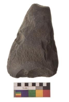 | Description / विवरण | Specimen of triangular shaped Axe with lenticular section and broken pointed butt. It is under side flat and upper slightly bulging out. |