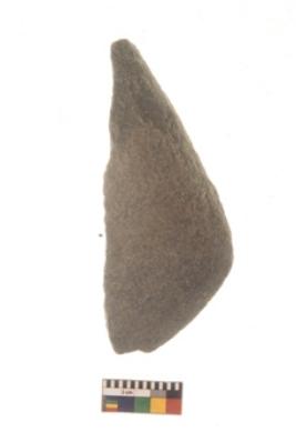 | Description / विवरण | Fragment of stone Axe.It is under side flat and upper slightly bulging out. |