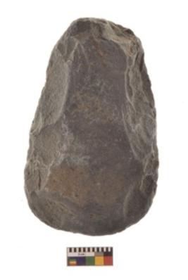 | Description / विवरण | Specimen of triangular shaped Axe with lenticular section and broken pointed butt. It is under side flat and upper slightly bulging out. It is having sharpe edge. |