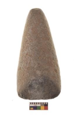 | Description / विवरण | Specimen of triangular shaped Axe with lenticular section and pointed butt. It is under side flat and upper slightly bulging out. |