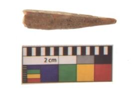 | Description / विवरण | Specimen of a polished bone point made on long bone, it has pointed top, It is rectangular cross section in shape with flat and thick body. |