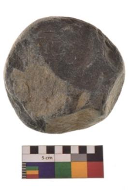 | Description / विवरण | Specimen of a spherical shaped hammer stone with battered surface. It is having flat base. |