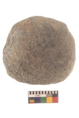 | Description / विवरण | A complete specimen of a spherical shaped hammer stone with battered surface. |