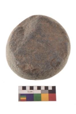 | Description / विवरण | Specimen of a spherical shaped hammer stone with battered surface. It is having flat base. |