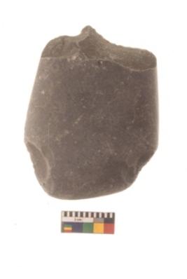 | Description / विवरण | A Partially broken specimen of a oval shaped pounder stone with Oval section. It heaving battered surfaced and truncated end to hold the object. |