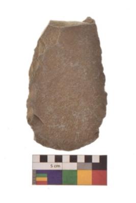 | Description / विवरण | Specimen of triangular shaped Axe with lenticular section and broken pointed butt. It is under side flat and upper slightly bulging out. |
