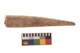 | Description / विवरण | Specimen of a polished bone point made on long bone, it has sharp pointed top, It is rounded cross section. |