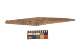 | Description / विवरण | Specimen of a polished bone point made on long bone, it has blunt pointed both side. |