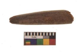 | Description / विवरण | Specimen of a polished bone point made on long bone, it has pointed top, It is rectangular cross section in shape with flat and thick body. |