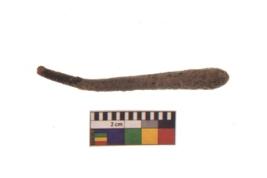 | Description / विवरण | A long nail with pointed functional bottom end and round slightly projected top with loop shaped. It is broken Piece with highly corroded in present condition. |