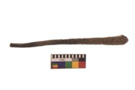 | Description / विवरण | A long nail with pointed functional bottom end and round slightly projected top with loop shaped. It is broken Piece with highly corroded in present condition. |