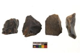 | Description / विवरण | There are n 4 of utilized worked cores and have multidirectional irregular dominant scar pattern on both dorsal and ventral sides. One has a broken tip. |