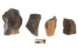 | Description / विवरण | There are n 4 of utilized worked cores and have multidirectional irregular dominant scar pattern on both dorsal and ventral sides. Three have a broken tip. |