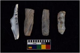 | Description / विवरण | Specimen of flakes tool with prominent flaking marks. It made up of a short flakes with sides trimmed. |