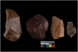 | Description / विवरण | There are n 4 of utilized worked cores and have multidirectional irregular dominant scar pattern on both dorsal and ventral sides. Two have a broken tip. |