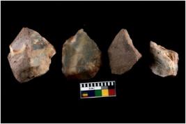 | Description / विवरण | There are n 4 utilized flakes. There are multi directional irregular scar pattern on both dorsal and ventral face of the flakes. some of them are sharp at one end and few are tapering edges. |