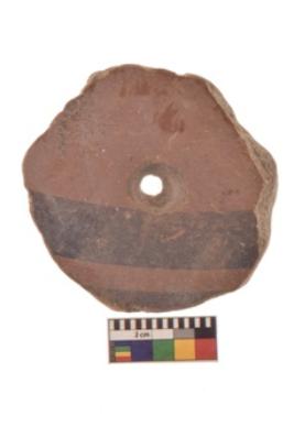 | Description / विवरण | Specimen of terracotta Wheel. It is red ware rounded shape with center perforation. |