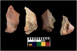 | Description / विवरण | There are n 4 utilized flakes. There are multi directional irregular scar pattern on both dorsal and ventral face of the flakes. three are tapering and one has sharp edge. |