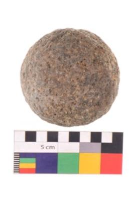 | Description / विवरण | Specimen of a sling ball with rough and round surface. It is blackish in colour. |