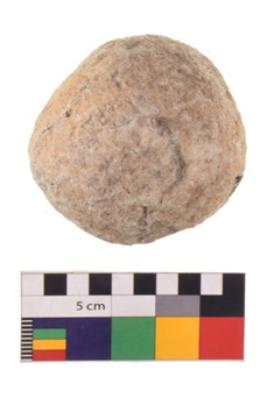 | Description / विवरण | Specimen of a sling ball with rough and uneven surface. It is creamish in colour. |