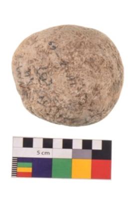 | Description / विवरण | Specimen of a sling ball with rough and uneven surface. It is creamish in colour. |