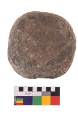 | Description / विवरण | Specimen of a roughly round shaped hammerstone with battered periphery along with the circumference. It is blackish in colour and has flat base. |