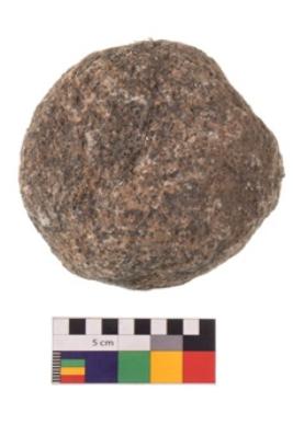| Description / विवरण | Specimen of a roughly round shaped hammerstone with battered periphery along with the circumference. It is greyish in colour. |