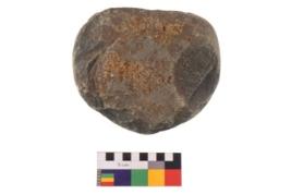 | Description / विवरण | Specimen of an uneven shaped hammerstone with smooth surface. It is blackish in colour and has flat base. |