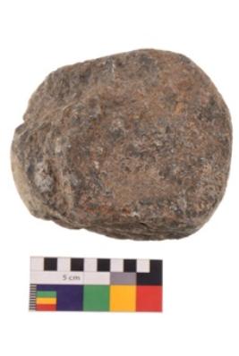 | Description / विवरण | Specimen of an uneven shaped hammerstone with battered periphery along with the circumference. It is brownish in colour ahs has flat base. |