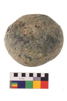 | Description / विवरण | Specimen of an uneven shaped hammerstone with battered periphery along with the circumference. It is grayish in colour with flat base. |