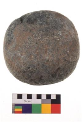 | Description / विवरण | Specimen of a round shaped hammerstone with smooth surface. It is blackish in colour and has flat base. |