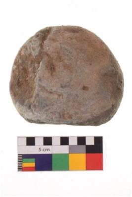 | Description / विवरण | Specimen of an uneven shaped hammerstone with smooth surface. It is creamish in colour and has flat base. |