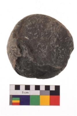 | Description / विवरण | Specimen of a roughly round shaped hammerstone with battered periphery along with the circumference. It is blackish in colour. |