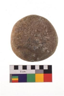 | Description / विवरण | Specimen of a roughly round shaped hammerstone with smooth surface. It is brownish in colour and has flat base. |