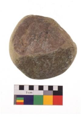 | Description / विवरण | Specimen of an uneven shaped hammerstone with smooth surface. It is brownish in colour and has flat base. |