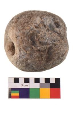 | Description / विवरण | Specimen of a roughly round shaped hammerstone with battered periphery along with the circumference. It is creamish in colour. |